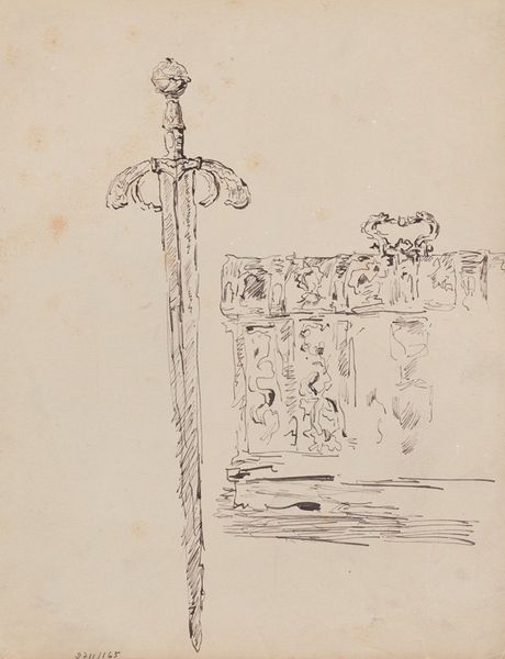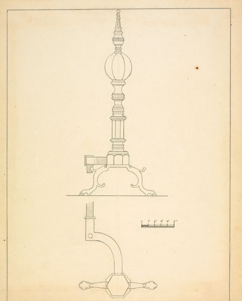 Curator: Looking at this "Wrought Iron Cross," estimated to be from 1936, the artist has rendered an interesting perspective with watercolors, ink, and graphite. The cross itself, rather ornate, stands atop what looks like a stepped stone base. Editor: Oh, it has such a wonderfully muted, somber air about it, doesn’t it? Like a half-remembered dream shimmering in greys. It's less a statement of faith and more of a ghost story, a whisper in iron. And that surrounding landscape feels like it’s holding its breath. Curator: I think the use of media here invites that effect. It's on paper, giving a sense of lightness and impermanence—but then rendered to depict metal, so it presents that striking contrast. I'm curious how it situates within artistic trends. How do you interpret this depiction historically? Editor: Well, consider that this work was created during the Depression era. We're dealing with an economic crisis which really challenged social structures. Artists looked to symbols, familiar shapes that might signify hope but also remember suffering. Public art takes on this weight, doesn't it? It both consoles and compels memory. I imagine that quiet backdrop represents an affected community. Curator: True, I can imagine then it provided both visual solidity in uncertain times. And also the wrought iron is quite beautiful in its embellishments, softening a form loaded with history. Those curving feet, are they a reaching or an embrace? Editor: Precisely! It is ornate, but it is grounded and, despite its stillness, invites questions. The duplication of its design nearby reinforces that idea as though we’re seeing different layers to something. Curator: So as we reflect on it, is there anything in particular that this drawing reveals? Editor: To me it is the paradox, simultaneously fragile and imposing. It encourages us to confront hardship, not just to endure. How does the combination of the delicate materials with something enduring hit you? Curator: Exactly, its ability to capture resilience despite adversity, so gently depicted. The artist almost makes the medium invisible allowing us to see the essence behind its familiar image. And on the personal side, to let us remember what is truly important in front of change. It's a beautiful thing.