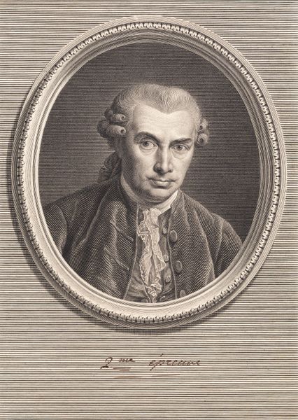 Curator: This portrait by J.F. Clemens, an etching from somewhere between 1748 and 1831, features Joh. H. Wessel. There's a stillness to it, wouldn’t you say? A sort of… contemplative quietude. Editor: Absolutely, it's subdued, almost monochromatic. It appears quite detailed and finely wrought for an etching – and I am wondering about the nature of the printing press. The amount of work in the linear hatching must have taken a while to render this plate! Curator: Oh, absolutely. Look at the way the light catches the fabric of his coat, the subtle shading around his eyes. It gives the impression that Clemens knew Wessel well, or at least observed him intensely. Do you get the sense of a specific narrative about him or time period? Editor: The labor really interests me; the repetitive, almost meditative act of creating those tiny lines, considering it was all manual. Etching, for me, always brings up questions about print culture. Who was the target market for this type of print? Were these mass-produced, or considered art objects from the beginning? What kind of labor laws existed? Curator: That's fascinating! It makes you consider the accessibility of art in that era. Thinking about this piece as an artifact – and how it existed. But on the purely visual side, isn't there a delicate balance here? The subject isn't idealized; Wessel is presented realistically. And it invites us to really observe someone long gone. I feel some Baroque era elements in there; the theatrical use of light and shadow perhaps, even if softened. What else? Editor: The portrait indeed feels lifelike; maybe the original copper plate was widely distributed? These prints would become dispersed through trade or perhaps travel to other countries and cultures. That kind of reach always affects our reception. Curator: Absolutely. It deepens our perception and highlights aspects previously unseen. Now, as we move on to the next piece... Editor: Agreed, let's go consider how distribution mechanisms affect artmaking next!