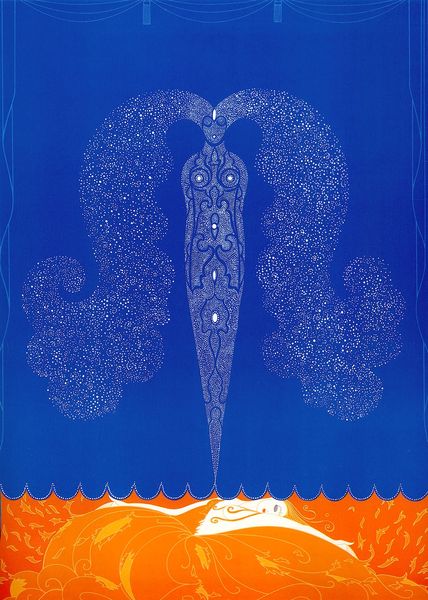 Editor: This print is "Ace of Clubs" by Erte. I am not sure when it was created, but it's got such a striking look! The figure feels very composed, almost theatrical with her exaggerated form and the elaborate headdress. How do you read this work, what comes to your mind when you look at it? Curator: Ah, Erte! A visionary. I see a distilled essence of Art Deco, all glamour and symbolism. The “Ace of Clubs” isn’t merely a playing card reference; it's a representation of power, luck, and perhaps a touch of the capricious nature of fate. I am instantly transported back to a time when extravagance and theatricality reigned. I love Erte's unapologetic boldness! Editor: The fate you mention really adds depth to this art. Curator: Consider how he plays with geometric forms. The figure almost *is* the club symbol, flattened and stylized. It's less about naturalistic representation and more about creating a visual statement, don’t you think? Look at the detail; the cascade of gold beads and the symmetrical balance. It’s meticulously crafted! Do you get a sense of the roaring twenties looking at this figure? Editor: Absolutely! It's a very evocative snapshot of that period! What about those flowers she holds? Do they also carry a symbolic weight? Curator: Most definitely. In the language of flowers – popular at the time - each bloom has its meaning. Here the message depends on the particular flower. The artist blends it into an overall tableau that invites the viewer to dream and interpret, don't you think? Editor: I do now! The composition is playful, even if the expression is more severe. It does a very great job to open up interpretive horizons! Curator: Absolutely! Each time I visit this artwork, it feels different, as though the Ace of Clubs reads *me*. Perhaps art looks at us in ways we never think!
