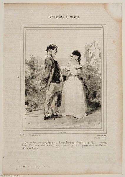 Editor: This print by Paul Gavarni, titled "And your geometry . . . let's see! Beauminet, what is a circle?" depicts a scene of domestic life. The father looks stressed, and I'm wondering about the story it tells beyond a simple family outing. What can you tell me about the social context of this piece? Curator: The image is from a series called "Impressions de Ménage," which translates to "Household Impressions." Gavarni was a keen observer of Parisian society. Prints like this, mass-produced and widely circulated, played a crucial role in shaping middle-class values and anxieties about family, education, and social status. Does the father's visible struggle resonate with modern parental roles? Editor: It does, actually! It makes me think about the pressures parents face to be both providers and educators. Thanks! Curator: You're welcome. It is interesting how relevant art from the past remains today.