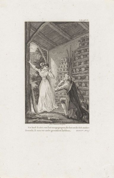 Curator: This lithograph, dating back to 1835, is titled "Man klopt aan de deur van een huis" ("Man knocks on the door of a house"), a work attributed to Paul Gavarni. Editor: My first thought is that there's a distinct sense of anticipation here, or maybe even apprehension. The figure seems hunched, as if trying to remain unseen while carrying something bulky and awkwardly towards that doorway. Curator: That's interesting, given the context we can discern. This piece, currently held in the Rijksmuseum, appears to capture a fleeting moment rooted in the sociopolitical currents of 19th-century France. Genre paintings often provided subtle commentary. The narrative may reflect someone approaching seeking entry or aid during periods of upheaval. Editor: Absolutely. I notice the detail in the clothing, suggesting a certain social stratum – possibly a rural, working-class figure. The monochromatic tones create a somber, almost urgent mood, further accentuated by the bare, overgrown surroundings. Are those thorns creeping across the door? And what of the object in their hand, like a key or tool? Curator: Good eyes, you noticed the key, too. The surrounding, rendered in such high contrast of black and grey is representative of Romanticism; a visual vocabulary, rife with themes of longing and escape, further underscored in Gavarni's choice of subject. Consider that within burgeoning cities and industries, people grappled with questions of national identity and belonging. Editor: The key definitely adds to the symbolic weight. Doorways are often thresholds, and keys signify access to what’s hidden. Is this an honest arrival, or something less so? What burdens does this individual carry? What cultural memory does such a scene tap into? Curator: By looking at how such scenes of hardship can inform gender or race at this particular time might allow new entry into broader and urgent societal concerns. Editor: Exactly. Art can unveil shared vulnerabilities in surprising ways, prompting necessary dialogue on shared histories of inequality. Curator: A powerful testament to the subtle resistance and human tenacity interwoven throughout seemingly quotidian realities. Editor: Yes, the scene underscores a quiet but forceful symbolism embedded in even the humblest of moments.
