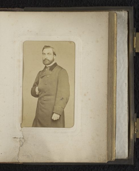 Editor: Here we have "Portret van een man," or "Portrait of a Man," a gelatin silver print photograph dating from around 1860 to 1900. The man's serious expression gives it a rather solemn, contemplative mood. What do you see in this piece? Curator: It's striking how the photographic medium lends itself to the capture—or performance—of piety during this era. Observe the book, presumably religious scripture, held firmly in his hand, and the stern clerical garb. Editor: It looks almost performative. Curator: Precisely! The symbolic weight is layered. He's not merely a man; he's presenting himself as a vessel of faith. Consider the societal role: he's part of an institution, conveying authority and moral certainty in a rapidly changing world. Do you sense the tension between personal identity and prescribed representation? Editor: Yes, the severity contrasts with the vulnerability that photography can reveal. It makes me think about who he was, and not just who he represents. Curator: Photography's inherent realism collides with the deliberate crafting of an image. We see his individual features—the cut of his beard, the slight furrow in his brow—juxtaposed with symbols designed to evoke something far grander. Editor: I now appreciate the depth behind what I initially perceived as just a solemn portrait. It's a fascinating interplay between identity and symbol. Curator: Indeed. This portrait reminds us that even the simplest images carry cultural memories, acting as time capsules filled with both conscious messaging and latent anxieties.