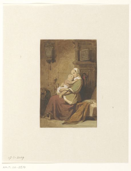 Curator: What an arresting image—the light and shadow feel incredibly immediate. Editor: Yes, there is an incredible intensity here, something almost severe in the geometry of light bisecting the wall. Well, this engraving, dating from roughly 1809 to 1848, is entitled *Lezende oude vrouw*, or "Reading Old Woman" by Willem Jan Paling Jz. What strikes you particularly about it? Curator: The way she's holding the book, almost defensively, her brow furrowed in concentration... books are potent symbols of knowledge, but here they seem a source of unease. Editor: Agreed. It seems the act of reading itself becomes an emblem for accessing, and potentially grappling with, received wisdom and tradition. Note how the shadows around her might represent the unknown or the weight of history pressing down on her. What do you make of the domestic details? Curator: The candlestick, the rumpled blanket...they suggest a life lived in the quiet corners, domestic routines, even perhaps a world increasingly left behind. Perhaps a symbolic passing of time is present here? Her face certainly suggests such narratives. Editor: Paling Jz. utilizes a delicate etching technique here, hasn't he? Look at the way he articulates the subtle wrinkles on her face, or the intricate folds of her clothing. It invites such intimacy, wouldn't you say? This intimate portrayal of aging seems to elevate a figure typically ignored within grand narratives. Curator: Precisely. There’s dignity, even beauty, in the lines etched by time—it’s a potent reminder that wisdom and resilience are forged in the crucible of experience, not in some abstract ideal. I will leave the viewer with that sentiment today, I think. Editor: It does offer us an opening, then, into reconsidering how we value the unsung heroes, and to seeing beyond superficial aesthetics.
