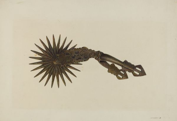 Gerald Transpota made this watercolour on paper, Spur, sometime between 1855 and 1995. Transpota lays down the hues in thin washes, a process of layering and building up the image gradually. The colour palette is earthy and muted, dominated by browns and greys. Look closely, and you will see how the colour and texture of the leather strap contrasts with the metallic sheen of the spur itself. The circular form of the spur is echoed in the rivets and in the toothed wheel, creating a satisfying visual rhythm. And the neutral background throws the object into stark relief. I keep thinking about the small dashes of paint around the toothed wheel. Transpota has captured light hitting metal. It reminds me of Giorgio Morandi and his still life paintings of bottles, although Morandi's objects are often softened and abstracted, whereas this is more precise. It is a beautiful and intriguing thing, this spur.