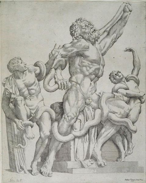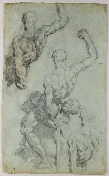 Editor: So, here we have an intriguing drawing from the 17th century, titled "Three male nudes from the Battle of Cascina." It's unsigned, simply attributed to 'Anonymous', done in pencil, and currently held at the SMK in Copenhagen. What I find most striking is the intensity and dynamic poses, even though it’s just a sketch. What can you tell me about the significance of this piece? Curator: Well, this drawing gives us insight into the artistic process of the time. It wasn't just about producing finished works; the preparatory sketches held value, revealing how artists studied anatomy and planned compositions, especially for large projects with political resonance. These ‘academic’ studies reflect not just the artist’s training but also the broader societal function of art as a tool for conveying power and idealizing the human form. Notice how the poses are somewhat theatrical. Why do you think that is? Editor: Perhaps to showcase the artist's skill or create a sense of drama appropriate for depicting a battle? Was the 'Battle of Cascina' a particularly important subject? Curator: Absolutely. The Battle of Cascina was intended to be depicted in the Palazzo Vecchio in Florence, and the commission itself—given to both Michelangelo and Leonardo da Vinci—was heavily laden with political implications for the Florentine Republic. These drawings become a sort of echo of that original civic aspiration. Think about the message these nudes would convey in a public space back then. Editor: Strength, civic duty, and perhaps an ideal of the male citizen soldier? Curator: Precisely. And consider the institutions that preserved these sketches: academies, private collections. They contributed to the canonization of artistic ideals and the formation of taste. Did these drawings only stay inside academies? Editor: Probably not exclusively. They would have circulated amongst artists and collectors. So a work like this sketch shows art working within very specific institutions to promote socio-political agendas. That makes sense. Thank you for making this insightful connection. Curator: Indeed! And reflecting on that connection reminds me how deeply intertwined art is with the society that produces it, both past and present.