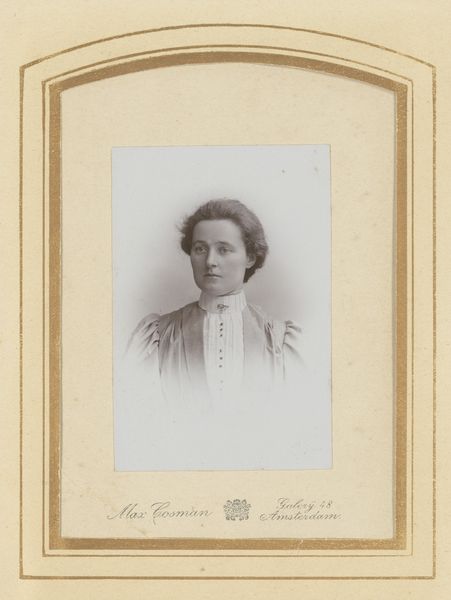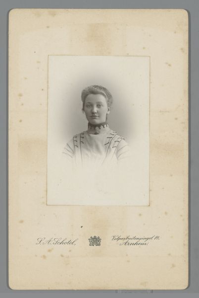 Editor: This gelatin silver print, “Portret van een onbekende vrouw” by Stephanus Adrianus Schotel, dates to around 1900-1910. It has such a subdued, almost ethereal quality. What stands out to you, observing its composition? Curator: I am struck by the carefully considered arrangement of tonal values. Note the subtle gradations within the woman's face, a study in light and shadow. Consider how the soft focus contributes to an overall sense of classical beauty, aligning with academic ideals of the period. How do you interpret the textural contrast between the delicate lace at her collar and the smoothness of her skin? Editor: I hadn't focused on the texture so much. Now that you mention it, the lace has incredible detail, contrasting so well with the otherwise soft focus. Is that intentional, or just a feature of the gelatin silver process? Curator: Intentionality is crucial to such compositions. Observe how the differing textures draw attention to the craftsmanship while highlighting her face and neck. This juxtaposition guides the viewer’s gaze and emphasizes certain formal qualities. How does this guide our understanding? Editor: I see! The detail directs our eyes, but also adds to the impression of her youthfulness and delicacy through textural and tonal contrasts. I appreciate you directing my gaze in this way. Curator: Precisely. Attending to formal elements provides invaluable insight. What have you learned during our analysis? Editor: Focusing on form revealed so much about what photography from this time had to offer and taught me a way to look closer and find deeper understanding. Curator: Yes, and this approach transcends period, offering a solid foundation for approaching visual works from any point in history and geography.