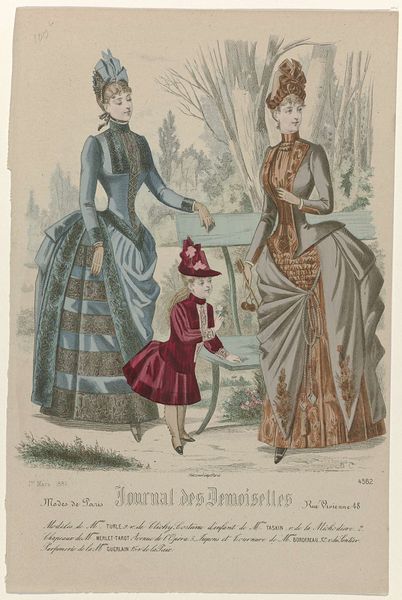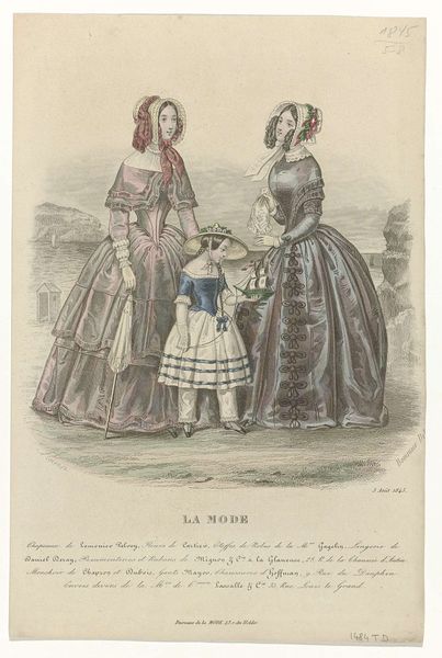 Editor: Here we have "Two Women and a Girl, May 1870," a drawing made between 1870 and 1875 by Jules David, housed at the Rijksmuseum. It's watercolor on paper, and right away, I'm struck by how delicately the fabrics are rendered; it's almost photographic in its detail. What do you notice first about this piece? Curator: Oh, that gossamer touch of the watercolors gets me every time. It's like stepping into a Jane Austen novel. But more than just fabric, isn't it fascinating how David captures the… unease, almost, in their postures? They're present, but slightly detached, lost in thought bubbles we can’t quite glimpse. Don't you get a sense of untold stories? Editor: I hadn’t thought of “unease," more like poised expectation. Untold stories, yes, absolutely! Is that typical of portraits from this period? Curator: It's a slice of "genre-painting," that invites you to imagine what is the untold. And maybe "unease" is my 21st-century reading—perhaps they're merely observing social niceties, holding back secrets we all keep. It’s delicious, isn’t it, to consider! Does it shift your reading if you focus not on who they *are*, but the possible hidden narrative between them? Editor: Definitely. Now, I'm picturing them plotting something… or someone! I wonder, do the colors or the lightness of the watercolour suggest anything about mood of that era? Curator: The watercolor brings an airiness that is also deceiving. David has perfectly rendered the clothing fashions but made their setting soft; so he gives detail while remaining mysterious. This era grappled with so many social questions – isn’t that exactly like these women appearing well put together, but… Editor: So true! I’ll never look at a watercolor the same way.