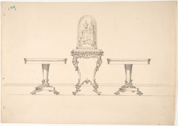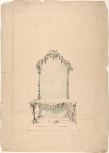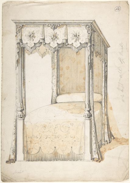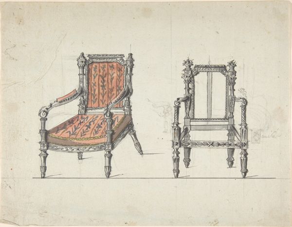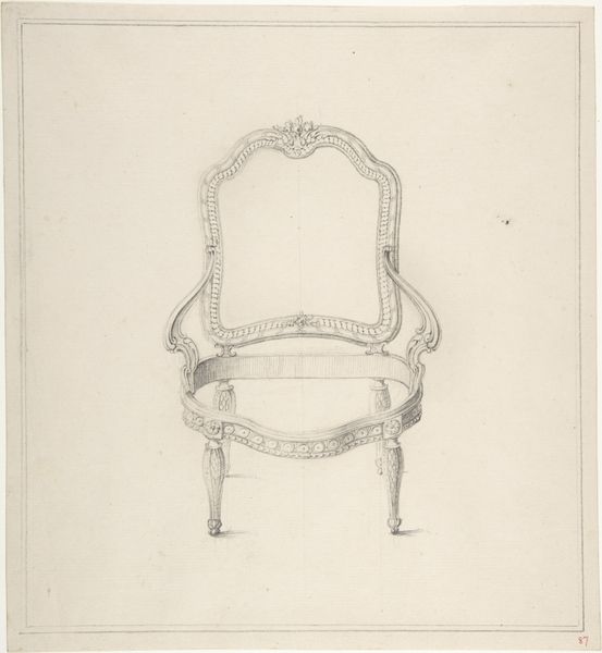 Editor: This is Johann Peter Krafft's "Study of a Chair Back," rendered in pencil on paper. It has an old feel with a sort of unfinished quality about it. It also strikes me as remarkably detailed for a preliminary study. What stands out to you, especially regarding the composition itself? Curator: Thank you. Focusing solely on its visual components, observe how Krafft orchestrates a dialogue between precision and suggestion. The architectural rigor of the chair's frame is evident, defined by clean lines, and precise angles, particularly at the bottom. Yet, note how these edges contrast with the haziness of the seat. Do you see how the velvety shading suggests volume? Editor: Yes, it gives the seat a plush look, very different from the hard frame of the chair. So the contrast adds depth to the composition? Curator: Precisely. Also, look at the paper itself: the warm tone serves as a blank space but also subtly augments the play of light across the chair's back. Notice, too, how the upper portion is barren. Editor: Now that you mention it, the empty space at the top adds to the chair's almost lonely presence on the page. I hadn't considered how much the negative space contributes. Curator: Yes, negative space acts almost as a compositional counterpoint to the intricacy of the structure, creating balance and highlighting the subject. Consider how the medium—pencil—enables a study of both texture and form. Editor: So, the combination of technique and materiality creates a multi-layered visual experience, drawing attention to both what is represented and how it's represented? Thank you. Curator: Precisely. This is also an art that trains us to look—to consider line, composition, balance—which allows the mind to better understand forms of all kinds. It has been a delight to share this observation with you.