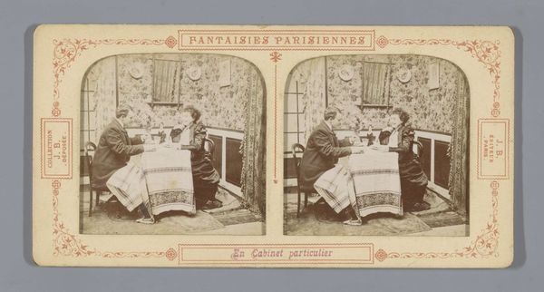Curator: This albumen print, a photographic work entitled "Man en vrouw proosten tijdens een maaltijd," or "Man and woman toasting during a meal," comes to us from around 1855-1875, created by an anonymous artist. Its format, notably, is that of a stereoscopic card, popular at the time. What are your first thoughts? Editor: It's unsettling. The seediness is almost palpable—the scattered clothes, the woman’s pose, and the way the man is eyeing her glass feels heavy with unspoken power dynamics. Curator: Yes, that unsettling feeling might come from a reading of symbolic elements here. We have the toast, typically associated with celebration and unity, here tainted by what you point out is a power imbalance. The act of sharing a drink carries symbolic weight, particularly concerning social contracts. Is it complicity, entrapment, or an uneven distribution of influence? Editor: The title “Parisian Fantasies,” visible on the card itself, tells us everything we need to know, I think. This wasn't meant as an innocent genre scene. This image exploits and commodifies a fantasy that hinges on gender and class inequalities. This wasn't displayed in the home. Curator: Consider also the enclosed space—the composition confines the figures, heightening the tension. We observe this “private room,” implied also in the lettering "En Cabinet particulier," which reinforces themes of exclusion and secrecy. This can elicit voyeuristic interest on one hand, and discomfort regarding personal transgression on the other. The artist's anonymity seems complicit, and so viewers find themselves asking questions of their own ethics. Editor: Right, it pushes us to confront uncomfortable questions about ourselves and our complicity in systems of objectification. How the consumption and distribution of images can have political consequences. I would add that the woman’s somewhat blurred form—suggesting the photographer made sure not to focus on her—reminds us she's just one figure in the broader political economy of looking. Curator: Such art speaks to a broader anxiety of modern life and transformation, especially given the rapid technological changes associated with early photography and its use. So a work like this really highlights both the past it's representing, as well as our complex relationships with history and its reverberations through symbolism. Editor: Ultimately, by acknowledging this photograph’s problematic undercurrents, we become better equipped to tackle harmful societal patterns today.