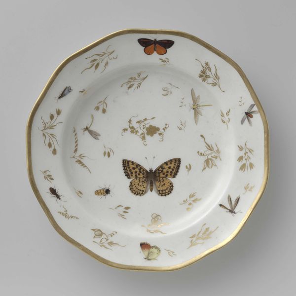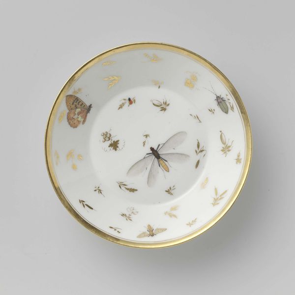 This saucer, decorated with insects, flower sprays, and grapevines, was crafted by Rue Thiroux Parijs. The imagery here is not simply decorative. In the Dutch Republic, the detailed rendering of flora and fauna often carried symbolic weight. Insects, for example, could represent transformation, diligence, or even the fleeting nature of life. This period saw the rise of scientific observation, with artists contributing to the documentation of the natural world. The level of detail suggests a patron with a keen interest in natural history, reflecting the growing influence of scientific societies and botanical gardens. The choice of porcelain itself speaks to global trade networks and the dissemination of luxury goods. To fully understand the context of this piece, we might turn to period publications on natural history, records of trade routes, and studies of Dutch social customs. The meaning of this art object is deeply interwoven with its social and institutional context.