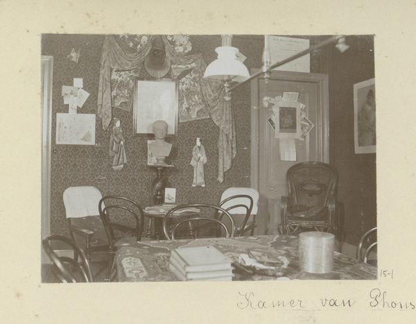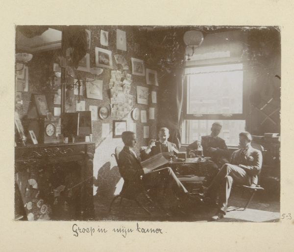 Hendrik Herman van den Berg took this photograph, 'Three Young Men Sitting in Hendrik Herman van den Berg's Room', sometime in the early twentieth century. It offers a glimpse into the domestic life of a Dutch artist and his social circle. The photograph presents us with a cluttered interior, walls adorned with various artworks, personal mementos, and decorative objects. The arrangement speaks to a culture of collecting, where personal identity is constructed through the accumulation and display of objects. Note the three young men casually posed, seemingly at ease in their surroundings. Are they fellow artists, intellectuals, or simply friends engaged in conversation? The photograph captures a moment of informal exchange within a private space. Understanding this image requires a look into the social and cultural history of the Netherlands at the turn of the century. Research into Van den Berg's life, artistic circle, and the broader cultural milieu would shed light on the significance of the objects and the relationships depicted. Ultimately, this photograph reminds us that art is not created in a vacuum, but rather is deeply embedded in the social fabric of its time.