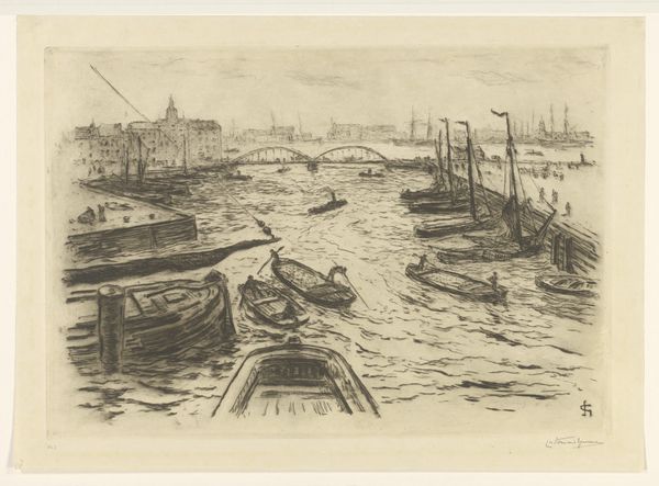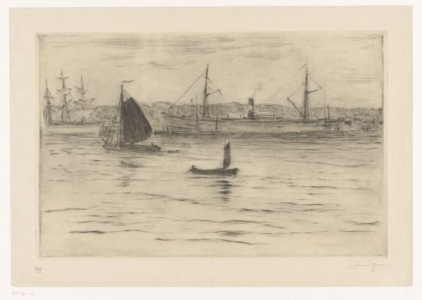 Carel Nicolaas Storm van 's-Gravesande created this etching titled 'Gezicht op de Maas te Rotterdam'. The composition is dominated by a series of horizontal lines suggesting the movement of water. The artist used subtle tonal variations to create a sense of depth and atmosphere. A detailed examination reveals an intricate network of lines, each contributing to the overall texture. The sparseness of detail in the buildings on the horizon, contrasts with the textured surface of the water closer to the viewer. This use of line and form might reflect the influence of Japonisme and its emphasis on simplified forms and asymmetrical compositions, which were highly influential during this period. The etching technique itself, with its capacity for fine detail and subtle gradations, mirrors a semiotic system; lines act as signs conveying information about the subject's form and texture. This approach to representation challenges fixed notions of realism, favoring a form of visual shorthand that invites interpretation.