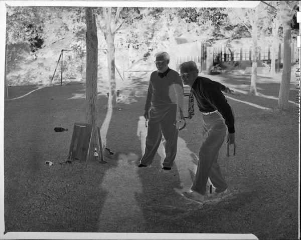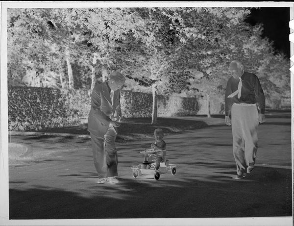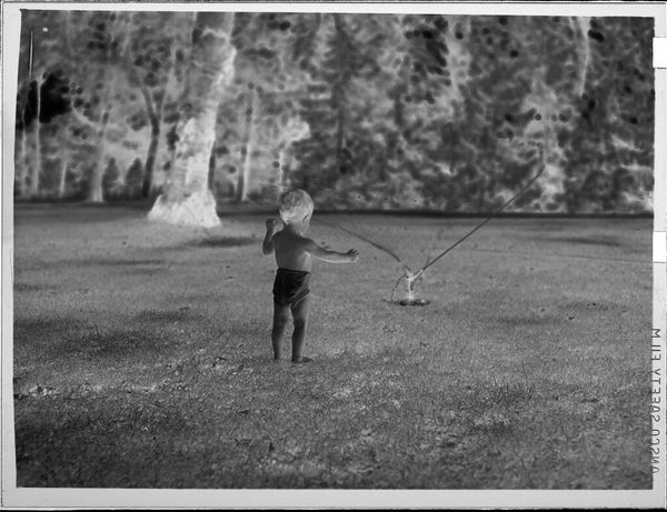 Curator: This evocative, though modestly sized, gelatin silver print comes to us from Lucian and Mary Brown. It's simply titled "Untitled (little girl playing in sprinkler)." Editor: Oh, it’s hauntingly beautiful. The high contrast makes it seem like a memory, doesn’t it? Fading but poignant. Curator: Yes, the contrast really emphasizes the liminal space of childhood – the girl caught between the safety of the lawn and the unknown of the sprinkler's spray. Editor: I feel the sheer joy of defying boundaries! Also, it makes me think of the lack of technology for kids back then. Curator: True, this piece speaks to a certain freedom in play, certainly different from our screen-saturated present. Editor: In that respect, it's a powerful reminder of the beauty in simplicity. Curator: Precisely. A simple moment in time. I like that. Editor: So beautifully preserved.