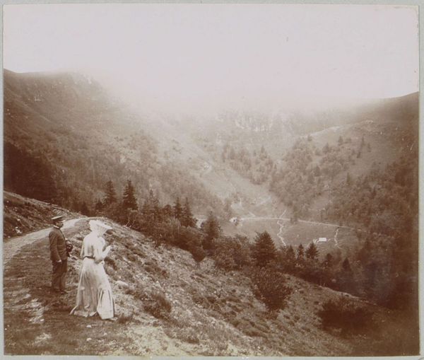 Curator: What a gripping sense of solitude I get from this photograph. The tiny figure of the wanderer just emphasizes the mountain’s immense scale. Editor: Indeed. This piece, titled “Wandelaar op een pad op de berg Gemmi in het Wallis” or “Wanderer on a path on the Gemmi mountain in Wallis," comes to us from Florentin Charnaux, circa 1871. Its restrained composition and subtle tonal gradations construct a landscape where the human presence is nearly absorbed into the formidable environment. Curator: The texture is striking! You can almost feel the rough stone, smell the crisp mountain air. It captures that solitary, meditative feeling that comes from confronting a powerful natural landscape. Editor: Look closely at the careful construction of space, that precise arrangement of forms within the photographic frame. See how Charnaux uses the path itself—that linear element receding into the distance—to draw us into the composition. The mountain wall forms a solid, imposing mass, while the distant valley opens to boundless possibility. Curator: It almost feels… theatrical. The way the light catches the edge of that mountain face, the shadowed figure in the middle distance... like a character pausing mid-scene. Editor: Certainly, a theatrical reading holds. The photographic medium flattens space, collapsing planes. That wooden handrail, for example—its geometrical clarity becomes more pronounced through this flattening, foregrounding issues of representation and artificiality. The relationship between that figure—diminutive, anonymous—and the geological immensity operates as a study of scale itself. Curator: He really seems to shrink into the surroundings, to dissolve into it... a visual representation of insignificance. Almost unsettling. Editor: I perceive not insignificance but placement. His placement gives scale to a sublime landscape of grand, architectonic form, which we access here through technical exactitude. This work serves as an astute comment on how the nineteenth-century eye, equipped with scientific tools and artistic ideals, interpreted the natural world. Curator: Yes... interpreted. Perhaps that's the source of its strange, unsettling beauty. We aren't simply seeing a mountain; we are seeing someone's idea of a mountain. A thought made visible. Editor: Precisely, and that distinction encourages a closer analysis, of this photograph as a constructed arrangement—a complex articulation of nineteenth-century values made manifest.
