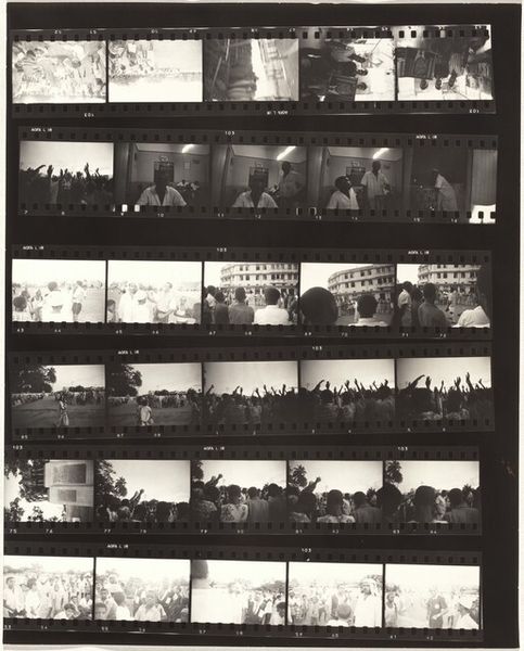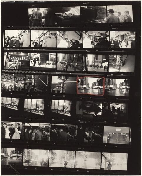 Editor: This is "Guggenheim 340/Americans 18 and 19—New Orleans," a 1955 gelatin silver print by Robert Frank. The contact sheet format, with its rows of miniature narratives, is like peering into little windows, almost voyeuristic. What grabs you most about it? Curator: That's a keen observation! It does feel like we're not just viewing photographs, but glimpsing fragments of real, lived experience, wouldn't you agree? Think of each frame as a captured breath, a frozen moment of a story unfolding. The overall impression… for me, it's one of fragmented Americana. What do you suppose Robert Frank aimed to capture? Editor: I think it might be the ordinary, day-to-day lives of Americans, but perhaps with a raw, almost detached perspective. He’s showing us these slices of life but doesn’t seem to be judging them. Curator: Precisely! Detachment is key, though it's layered with something more... a hint of melancholic beauty? Or perhaps something sharper, a quiet critique? Frank, as a Swiss immigrant, perhaps had the advantage of seeing America with fresh eyes. Do you notice the repetition of forms? Editor: Now that you mention it, yes! The lines of the bus in one strip, the similar groupings of people, almost mirroring each other... it gives the impression of both individuality and conformity existing side by side. Curator: Exactly! It is the visual echoes. Like rhyming verses in a visual poem. Each section sings a different tune, but they’re all bound by the same rhythm, the same pulse. The harsh blacks and whites also intensify that contrast, don't they? Editor: They definitely do! It all feels very immediate, unvarnished, even a bit haunting. It makes you wonder about the stories behind these fleeting moments. Curator: It invites us to contemplate our own stories, and the common threads that weave through all of us, doesn't it? A tiny, profound, treasure. What a thought, eh?