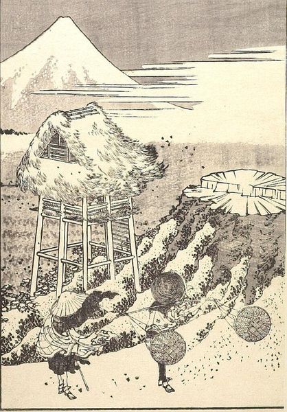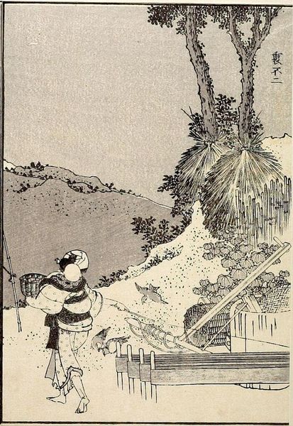 Curator: This is Hokusai's "Fuji under a Sluice," part of his "One Hundred Views of Mount Fuji." It's fascinating how he positions the iconic mountain within everyday labor. Editor: Yes, it's much more than a landscape, isn't it? All these people working really grounds it. What strikes you most about it? Curator: I see a commentary on the relationship between the human and natural worlds, and how we extract resources. Consider the sluice—is it a symbol of progress or exploitation? The figures seem burdened, part of a system. Editor: That's a powerful reading. I hadn't considered the exploitation aspect so directly. Curator: Think about whose labor is absent, too. Who built the sluice? What social strata are we not seeing represented here? Editor: That's a great point. It makes me reconsider the whole scene in terms of power dynamics. Thank you. Curator: Understanding art is an evolving process. I'm glad I could share a new perspective on this work.