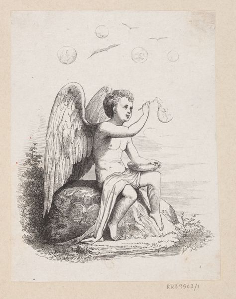 Editor: Here we have "Boy Blowing Bubbles" by Isaac Weissenbruch, created sometime between 1836 and 1912. It's a pen drawing, full of delicate lines. I find it rather charming and nostalgic. What do you see in this piece, especially thinking about imagery and symbols? Curator: This seemingly simple genre scene bubbles over with layered meanings. Consider the bubble itself. Ephemeral, iridescent – a classic *vanitas* symbol reminding us of the fleeting nature of life and beauty. Editor: So, the joy is bittersweet then? Curator: Precisely. Notice also the boy’s rather theatrical stance, his clothing reminiscent of an earlier era, evoking perhaps, a yearning for a past golden age, or an idealized innocence lost to time. And the rose! Do you notice how it echos in the drawing of the boy? Editor: Now that you mention it, yes, I see it. What about the placement of the table with the bowl. Why is it there? Curator: Ah, a very insightful observation! The bowl beside the child could represent containment or boundary. Is the child creating this bubble from "thin air" (bowl as air)? Editor: Wow. I would not have looked that deeply into this artwork. It’s not just a cute image anymore. Curator: It highlights how even seemingly innocent scenes can hold within them deep reflections on time, beauty, and the transient nature of existence. Images carry these layers through time; our engagement keeps them alive.