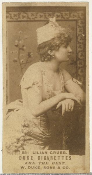 This is Miss Sutherland, from the Actresses series, a promotional card issued by Kinney Brothers, around the turn of the 20th century, to promote Sweet Caporal Cigarettes. Notice how the composition is neatly divided into sections, with the subject's head and shoulders taking prominence. This creates a sense of intimacy, drawing us closer to the sitter, and we can appreciate the texture of her hair and the fabric of her dress, rendered in minute detail. It’s a rather conventional portrait, but one that gains meaning when contextualized with other images from this series. These cards were essentially miniature advertisements, using images of actresses to create desire not just for the celebrity but for the lifestyle and aspiration associated with fame. The commodification of the actress's image for commercial purposes reflects a shift in the cultural status of actresses and their representation in the public sphere. As a semiotic object, the card functions as a signifier, laden with cultural codes relating to beauty, celebrity, and consumerism. It invites us to explore how images shape perceptions of identity.