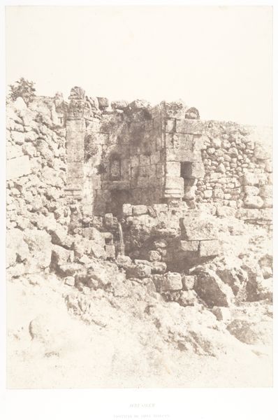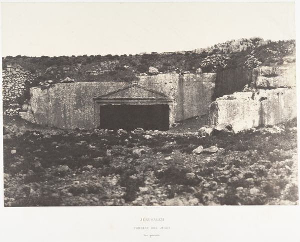Curator: This is Auguste Salzmann’s “Jerusalem, Tombeau Juif, Details," a daguerreotype created sometime between 1854 and 1859. It resides here with us at the Metropolitan Museum. Editor: Immediately, I sense a poignant stillness. The light, or lack of it, plays upon these ancient stones. It's as if the silence of centuries has been perfectly captured. It’s melancholic and strangely… comforting? Curator: The melancholic effect, I think, speaks directly to Salzmann’s context. He was commissioned to photograph the Holy Land with the express intention of "proving" biblical accounts. However, what he returned with were these profoundly still and contemplative images. Note, specifically, his technique and the tangible surface quality. Editor: Right, you see how the daguerreotype gives it that silvery sheen? The detail is astonishing, particularly considering the technology of the time. What interests me, though, is that conflict. Imagine being sent on such a literal-minded errand, and returning with something so evocative and… dare I say, spiritual in a way they weren't expecting? Curator: Precisely! Salzmann’s meticulous craft resists a purely documentary reading. His photographic choices speak volumes. The lengthy exposure times would demand subjects that were largely unchanging – like buildings and monuments, instead of the human narrative hoped for. It reveals, rather, the slow, geological, even architectural impact of faith and time. Editor: So, we're not just looking at a photograph of a tomb. We're confronting the weight of history, etched into stone, through the mediation of very early photographic processes and that ghostly image quality… It's a testament to impermanence and, perhaps, enduring faith found in the landscape. It's beautiful, yet it's unsettling, isn’t it? Curator: Exactly, and considering Salzmann's role, we must consider the labor involved—his choice of medium and processes over commercial availability, which brings forth interesting conversations on authenticity and intent within image-making itself. It becomes not just a tomb but also an object that speaks volumes of the choices available, and chosen by, a 19th-century photographer. Editor: A powerful collision of artistic expression and historical document—the quiet details shout, don't they? Thank you for highlighting this one; it's gotten under my skin, in a good way! Curator: My pleasure, a lot of nuance is found upon closer inspection.
