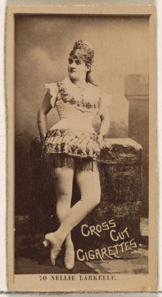 Curator: Here we have "Card Number 241, Dupree, from the Actors and Actresses series," an advertising card from the 1880s produced by W. Duke, Sons & Co. to promote Cross Cut Cigarettes. It's currently part of the Metropolitan Museum of Art's collection. Editor: Stripes and smokes, huh? My first thought: the past was definitely weird. She looks like she's escaped from some kind of wonderfully bizarre circus. Curator: Indeed, the portrait's formal structure is intriguing. The stark vertical stripes of Dupree’s lower garments are offset by the gentle curves of her upper attire and the blurred, almost dreamlike backdrop, creating a compelling visual dichotomy. Note the compositional interplay between the typography advertising cigarettes and the subject, implying a cultural value system where beauty endorses vice. Editor: Or, you know, a job is a job! There's something in her expression, too – a bit mischievous, like she knows she's part of the show, selling dreams along with cigarettes. I love the flatness of the print medium; it's so different from our slick, high-definition ads of today. Gives it an honest vibe. Curator: Precisely. The material reality—photography reproduced via print—is crucial. The card itself acts as a semiotic vehicle; the photograph is no mere depiction but a cultural artifact mediating performer, commodity, and consumer. Editor: It feels oddly intimate, too. You can imagine someone carrying this little card in their wallet. Like a tiny window into a vanished world, a little piece of vaudeville charm and societal… hmm, cigarette-endorsed hopes. It would be cool to learn about this Dupree and what she did on the stage. She probably knew the card would be used to peddle cancer sticks, maybe laughed all the way to the bank. Curator: Her role, then, extends beyond mere advertisement; she's an active participant in shaping the social text. The very texture of the aged paper emphasizes the photograph as a temporal marker, as a vestige of its original moment of cultural production and consumption. Editor: I'll stick with dreaming of her performance; your reading makes it all very serious. I feel like she had the best smile! But I agree that seeing how smoking got an endorsement through actresses like her and photography does provide insight into some different values from the 1880s!