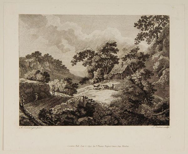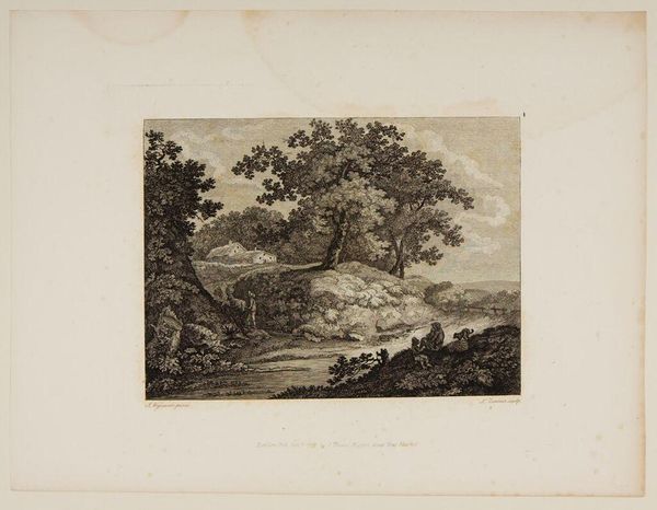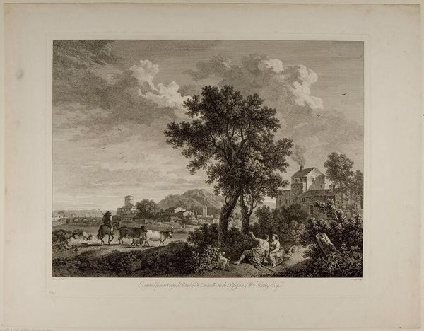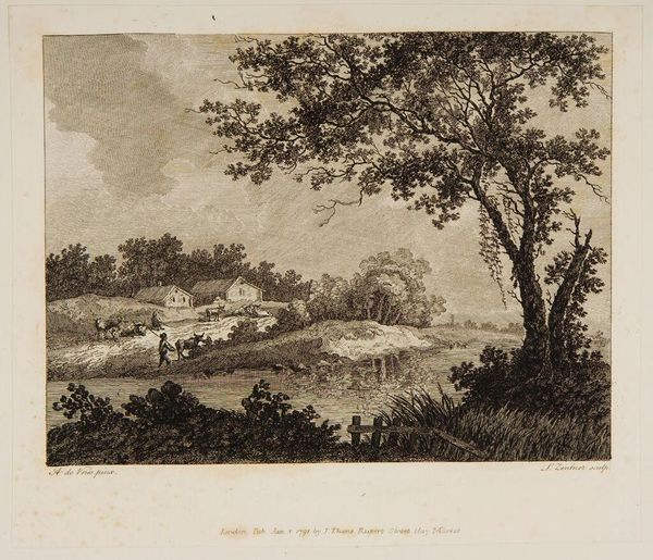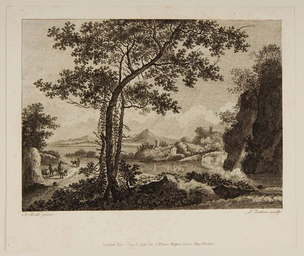 Editor: This is "Woman and Boy on the Road" by J. L. L. C. Zentner. I'm immediately drawn to the contrast between the intricate detail of the tree and the relatively simple rendering of the figures. What strikes you most about the composition? Curator: The meticulous etching technique creates a textural richness, doesn't it? Observe how the artist uses line weight and density to construct depth. Note how the interlocking branches of the tree create a complex structural pattern against the open sky. Editor: So, you're focusing on the lines and shapes themselves, and less on what the image represents? Curator: Precisely. The subject matter is secondary to the formal relationships at play. Consider how the artist’s structural choices impact the viewer's experience. Editor: That's a new way of looking at it for me, focusing on the composition first. Curator: Considering the art elements first is key to unlocking deeper understanding.