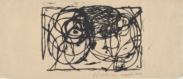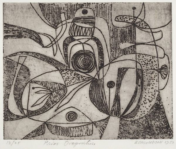 This print was made by Louis Schanker, using a woodcut technique. Consider how the wood's inherent qualities have influenced this abstract image. Schanker would have used gouges and knives to carve away areas of a woodblock. The remaining raised surfaces were then inked and pressed onto paper, leaving an impression. This process creates a direct relationship between the artist's hand and the final print. The texture of the wood itself also plays a role, adding depth and visual interest to the background. The linear qualities of the carving tools are evident in the bold strokes and intricate details of the composition, as well as the textural background. Woodcut is a labor-intensive process. This reflects the values of the Arts and Crafts movement, which championed handcraftsmanship. By embracing this technique, Schanker elevates printmaking from a purely commercial enterprise to a form of artistic expression. In doing so, he challenges traditional distinctions between fine art and craft.