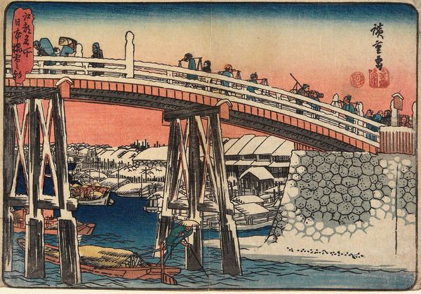 Curator: Look at this, Hokumyō’s woodblock print "Mannen Bridge at Fukagawa," created around 1834 to 1837. It resides here at the Minneapolis Institute of Art. It's a scene so full of life. Editor: It is! At first glance, it strikes me as incredibly peaceful. The blues and soft yellows create a sense of calm despite all the activity depicted. Curator: The bridge itself is the focal point, isn't it? Laden with people. It must have served an important function in the city's infrastructure. Think about the class dynamics present: who is traversing, who is on the boats below. Editor: Absolutely. And that faint outline of Mount Fuji in the background adds another layer, linking everyday life with a powerful symbol of Japanese identity. Is Hokumyō using Fuji as a commentary on the idealized and the everyday here? Curator: That’s definitely part of the dialogue here. The Ukiyo-e style immortalizes the transient world. The bridge wasn't just a crossing, but a site where social relations play out. The artist captures genre painting but elevates the image by emphasizing cultural history. Editor: It’s fascinating to consider the role of these prints in shaping perceptions of Edo, now Tokyo. Were they tools for disseminating information or for reinforcing existing hierarchies? The way the light hits that golden bridge, does it portray more the hopes and dreams, or also the burdens of its history? Curator: It is both, isn't it? The artist's composition certainly leaves us pondering the weight of societal expectations on people from this historic period. Were those living then able to consider their legacy like this? It certainly makes you think! Editor: Precisely. I hadn’t considered that interplay before, but now I wonder, how did it influence perspectives on race and gender then, or how are those stories being told today? Curator: Exactly, it gives you something to consider regarding art history! Editor: Indeed!