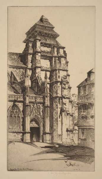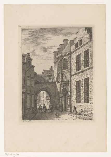 Curator: Ah, let me introduce you to "Gezicht op de Palingbrug te Antwerpen," a captivating cityscape etched by Henri François Schaefels in 1886. It's rendered in ink, using techniques of drawing and printmaking. Editor: Immediately, there's a somber feeling about this piece. All those sharp, vertical lines, they create such a claustrophobic atmosphere. And the lighting – the absence of it – emphasizes the heaviness. Curator: That's a fascinating reaction. Indeed, the artist’s skillful use of etching creates an incredible texture and detail, doesn't it? See how he uses varying line weights to describe the surfaces of the stone buildings and cobblestone street? There’s a wonderful play of light and shadow that really defines the forms. Editor: Right, the tonal variations really pop. It seems Schaefels really wanted us to be aware of the physical city—a celebration of materiality itself. You can almost feel the dampness of the stone in that alleyway. But you also can't avoid the almost oppressive sense of urban density! It also raises a question in my mind about memory – are we truly perceiving the architecture or is it all a blur in our minds? Curator: A beautiful observation! The piece exists at the juncture between physical experience and ephemeral interpretation. One could even suggest that in depicting an ordinary scene this way, he infuses the work with symbolic weight. Editor: Absolutely. I find that these intense black lines offer a compelling look into life in 19th-century Antwerp. Curator: It's an everyday slice of history, seen through an intensely rendered lens, making the familiar strange, and offering a glimpse into Schaefels' mind. What a splendid piece. Editor: Yes, exactly, by turning something mundane into something captivating, this etching has opened my eyes. It prompts a quiet contemplation.