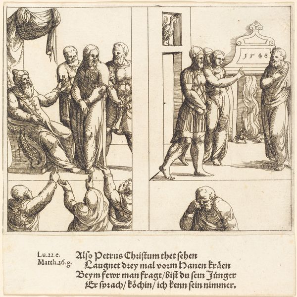 Curator: Let's examine "Ecce Homo, and the Jews Deny Christ," a 1548 engraving by Augustin Hirschvogel. Editor: The stark contrast in line work immediately strikes me. It creates a tension, almost a visual friction that underscores the conflict in the scene. What material insights does Hirschvogel's printmaking offer? Curator: The medium of engraving itself is crucial. The sharp, deliberate lines, etched with considerable labor and craft, allowed for wider distribution. Consider the paper and ink themselves, basic but vital materials, employed here to spread this religious and historical narrative throughout Renaissance society. It is no accident the means reflect the message. Editor: Indeed. Shifting to a more formal analysis, the composition divides neatly into two spatial planes, doesn’t it? Note the staging—almost theatrical in its presentation. Pilate presents Christ on one side while a crowd on the right makes demands, or pronouncements. Curator: Absolutely. The lines create texture and movement, pulling the viewer's eye. Notice the density of figures versus the relative openness of the space around Pilate. Hirschvogel uses this visual imbalance to emphasize the oppressive crowd dynamic, reflective of his culture's complicated religious tensions at the time. Editor: Also interesting, is the relative flatness in the figuration: Hirschvogel hasn't embraced the plastic values fully, even while depicting a historical scene. Curator: Agreed. It’s more about conveying information than illusion. The stylized faces, the repeated gestures; they're not aiming for realism, but to communicate a potent allegorical narrative through specific gestures that were familiar at the time. Editor: Yes, I am especially drawn to the textural effects achieved via the engraving process – such beautiful hatching marks defining shape and form; there is also something to be said about the consumption and dissemination of readily available printed art on the whole – accessible at this time to everyday individuals. Curator: Hirschvogel uses a deliberate starkness to underscore the seriousness of this historical subject matter. This artwork reflects how materiality, from its artistic process to cultural distribution, speaks volumes. Editor: The formal staging lends a critical intensity that remains long after viewing this print.