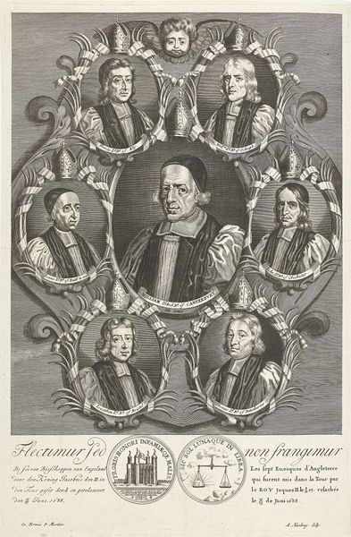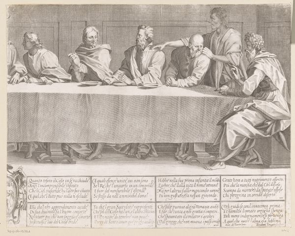 Editor: This is Allaert van Loeninga's "The Regents of the House of Correction of Middelburg, 1643," an oil painting capturing a group of men. The figures seem very formal, serious almost, with their dark robes and starched collars. What strikes me is how each face, while similar in tone, tells its own story. What do you see in this piece, beyond just a group portrait? Curator: It's interesting that you pick up on the individuality within the group, because group portraits of this era, especially of regents, often employed symbolism to reinforce power and order. Yet, here, the stark lighting on each face seems to highlight individual character. Consider the open book at the table's center. What does that evoke for you? Is it knowledge, power, transparency? Editor: Perhaps it's all those things? Knowledge because it’s a book, power because they're using that knowledge to govern, transparency maybe because it's open, as if available for all to see… though we can’t see what’s written inside. Curator: Precisely. That ambiguity is crucial. The open book becomes a symbol for the House of Correction itself – the potential for reform and betterment that’s offered but never fully revealed or guaranteed. Note too the sword hilt just visible on the lower right. It's a signifier of authority, yes, but its partial concealment also hints at something less overt, less spoken, than their stated purpose. These objects work together with the severe style to really create meaning. Editor: So, even a seemingly straightforward portrait of authority figures can hold layers of symbolic meaning about governance and perhaps even the limits of that authority. Curator: Indeed. And it challenges us to look beyond the surface to consider the nuanced psychology embedded within seemingly formal compositions, offering an alternative perspective into their history and society. Editor: This really changes how I look at group portraits now. There is so much more than what meets the eye. Thanks for all the insights!