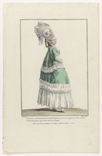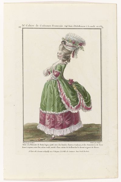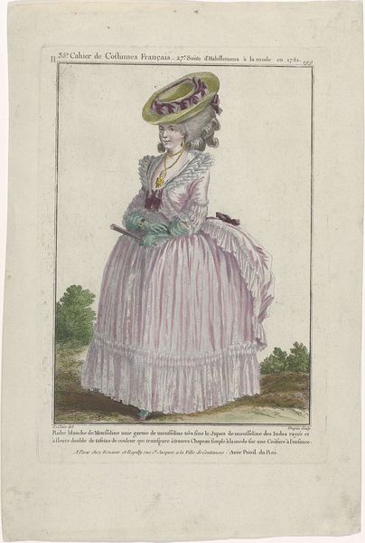 Curator: Ah, here we have "Gallerie des Modes et Costumes Français, 1778, N 77 : Jeune Dame de Lyon…", a print by Etienne Claude Voysard, dating from around 1778. A captivating example of Rococo fashion! Editor: My initial impression is just pure extravagance! The sheer volume of that dress is astonishing. It completely dictates the figure, overwhelming any sense of natural form. Curator: Precisely! Let's consider the materials and the labor involved. That dress is likely taffeta, known for its stiffness, allowing it to hold such a shape. Think about the weaving, the dyeing, the intricate pleating… It's a testament to skilled craftsmanship, wouldn't you agree? Editor: Absolutely. But consider the semiotics! The towering hairstyle, the pale skin, the delicate pose – they speak volumes about societal ideals and aspirations of the time. Pink often suggests youth, innocence, almost doll-like fragility which amplifies her ornamental status. Curator: Good point. The colour is intriguing, when we think about the dyes involved; consider the processes used to create these shades; the availability of dyes for the printmaking process reflects the colonial dynamics of trade at the time and this would impact the end result for the consumption for affluent elites. Editor: And this echoes, literally reflects the ideals around presentation that elite people wish to cultivate. Her very presence conveys a detachment from mundane tasks or manual labour. And let’s note the significance of the bouquet, symbolising fertility, perhaps desirability. All subtly communicating aspects of her position. Curator: It all speaks to a society fixated on appearance, consumption, and displays of wealth and position, it also hides some realities. This image presents such labour as a refined practice. Editor: And though the background suggests an outdoor setting with flowers in the distance, even this alludes more towards constructed and shaped, the image doesn't necessarily engage with a depiction of "Nature". Everything is controlled and deliberate. The entire image seems constructed around established symbolism, right down to that thoughtful, slightly melancholy expression. It reminds us about the expectations that society held, but, how it constrained lived experience. Curator: I agree. Looking at it this way, this "mode" from the late 18th-century doesn’t merely depict fashionable tastes, but also the systems, values and craft labour. Editor: A tiny image containing a much wider view of the 18th century through aesthetics, artifice and aspiration.