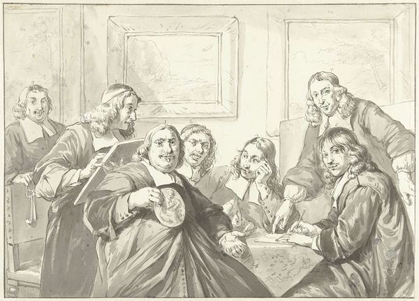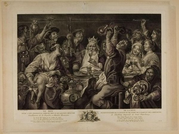 Editor: Here we have "the king drinks" by Ephraim Gottlieb Krüger. This print depicts a boisterous feast, but there's a strange mix of joy and unease in the figures’ faces. What's your take on the narrative being presented here? Curator: Ah, a feast for the eyes and soul! Krüger, with his witty needle, etches more than just a party; he captures a moment where merriment teeters on the edge of… well, folly. Notice the king, crowned and tipsy – is he truly in control, or merely a puppet of pleasure? Is it possible that the “king” is more a figure of fun than authority? Editor: That's a perspective I hadn't considered. The ambiguity of the king is thought-provoking. Curator: Absolutely, and it reminds us that even in revelry, there are layers of power, perception, and perhaps even a hint of impending doom. Cheers to that.