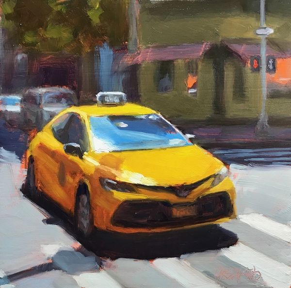 Dan Graziano's painting captures a New York taxi in oil on what appears to be a small canvas. The composition directs us immediately to that yellow cab, halted at a zebra crossing in a typically congested city street. Painted perhaps in the twenty-first century, this image is part of a longer tradition of urban realism, that captures the rhythms of working-class life. In its use of high-keyed colour and gestural brushwork, we might detect an effort to reclaim painting as a vehicle for conveying the energy and dynamism of modern life. A key resource here might be the artist's other cityscapes: are there common themes? As a historian, I'm interested in how this canvas presents an established set of visual codes to suggest an enduring sense of place. As our cities change, how might the artist help us to recognize what has been lost?