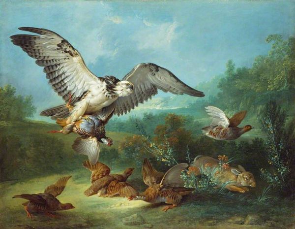 This canvas presents an anonymous creation depicting a hawk's violent attack on ducks. The hawk, poised mid-strike, embodies potent symbolism rooted in the ages. Consider the motif of the predator and prey, recurrent in art across cultures. The hawk, with its piercing gaze and deadly talons, often symbolizes power, dominion, and aggression. Yet, these symbols are not static. The image of the hawk as a predator is found in ancient Egyptian art, where it symbolizes divine power and protection, and it’s later reinterpreted in heraldry to signal military prowess. In contrast, the ducks represent vulnerability and innocence. This scene evokes primordial emotions – fear, survival, and the raw, unbridled forces of nature. It's a visual echo of humanity's own struggles and fears, engaging us on a subconscious level. This representation of the eternal chase is perpetually evolving, reminding us that cultural memory shapes our perceptions and imbues familiar symbols with ever-shifting meanings.