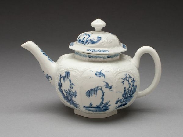 Editor: This is an earthenware teapot, “Teapot with Landscape,” created sometime between 1700 and 1733. What strikes me is how a utilitarian object like this is elevated through meticulous artistry. How would you interpret this piece? Curator: Considering the formalism, observe how the cobalt blue pigment meticulously details a panoramic landscape onto the ceramic form. The structure presents a balanced tension between the geometric lid and the rotund body, unified by the continuous narrative of the painted scene. Does the relationship between the functionality and decoration spark any observations? Editor: Absolutely. I appreciate the visual balance created by the curved handle mirroring the spout's silhouette. How does the painted landscape, contained within the circular form, play with the viewer's perception? Curator: Indeed, the imposed circular boundary influences how we visually consume the artwork, separating the landscape depicted from the surroundings in the exterior world. The painting style of this earthenware reminds me of Delftware and oriental aesthetics. Do you think its imitation makes the artistic value lower? Editor: That’s a great point, because even with the cultural context of imitation, it holds merit for the ways it manipulated form and composition! I’ve really gained insight into appreciating art through a formal lens. Curator: It has also been enlightening for me. Now when you study any kind of artistic work, be mindful about structure and how elements work together and contrast.