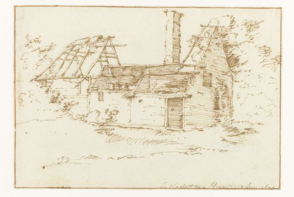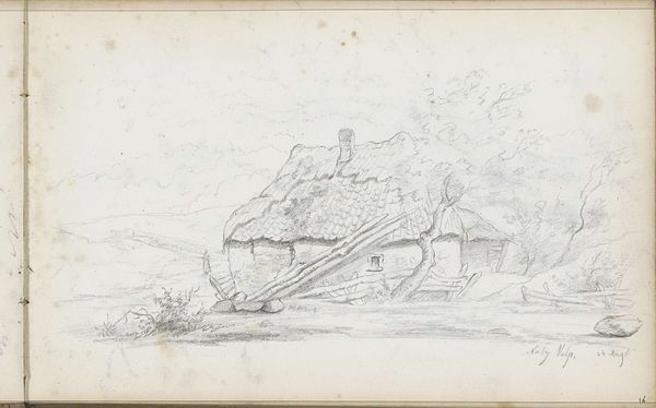 Editor: Here we have "Farmhouse with Figure at Bois Marteau" by Willem Roelofs, dating from around 1846 to 1851. It's a delicate pencil drawing. There’s almost a wistful, transient feeling to it – like a fleeting glimpse of rural life. What aspects of this work particularly resonate with you? Curator: It's precisely that perceived ‘fleeting glimpse’ that I find intriguing. Roelofs captures a romanticized view of rural life that was very popular at the time, yet it masks the socio-economic realities faced by peasants. This work becomes a point of departure for considering class, land ownership, and the idealization of peasantry within a rapidly industrializing society. Do you see that single figure? Editor: Yes, by the cottage, slightly obscured. Curator: Consider their placement. Are they an active participant or simply a picturesque addition to the landscape? Is Roelofs celebrating or subtly erasing their lived experiences by assimilating them into the scenery? These are the questions we should ask when engaging with landscape art of this period. We must consider how power structures shaped what—and who—gets depicted. Editor: That’s a compelling point. I hadn't considered the inherent power dynamics at play. Curator: Furthermore, reflect on the very medium, pencil. What does its accessibility say about the potential democratization of art at the time, and how does this image reinforce or challenge preconceived notions of class identity? Editor: I see. Looking beyond the surface beauty opens up so many crucial discussions. Thanks for shedding light on this, I definitely see it in a new light. Curator: My pleasure! Art offers these silent, potent entry points into understanding complex societal narratives.