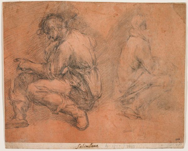 Curator: Welcome. Here we have "To studier til en grublende mand ved et bord", or "Two Studies of a Brooding Man at a Table", dating roughly from 1600 to 1650, attributed to Michelangelo Merisi da Caravaggio. It's ink on paper, and what strikes me first is how gestural it is. Editor: It immediately conveys a sense of introspection, doesn't it? The repetition of the brooding figure amplifies the feeling of heavy thought, almost sorrow. It reminds me of depictions of melancholia, those classical symbols of contemplation and even madness. Curator: Interesting that you key in on repetition, as I think the doubled forms reflect studio practice—explorations of form. Note the economical use of line. It seems that Caravaggio, or a follower, was less concerned with producing a finished piece than in documenting fleeting ideas. The support itself, paper, invites working through ideas. Editor: Absolutely. There is a sense of impermanence. I am drawn to the face, the brow, the weight of the hand on the face – each a carrier of internal strife. It speaks to enduring notions of male intellectualism and artistic genius as somehow intertwined with suffering. It’s the tragic hero archetype in quick sketch form. Curator: Considering the possible date range and Caravaggio’s influence, the means of production are telling. Ink drawings were quickly reproducible through prints, spreading visual ideas related to affect widely through Baroque society. This could have disseminated Caravaggio's signature emotive naturalism into other artistic production. Editor: Yes, and the very act of reproducing images is central to the symbol’s longevity. Think of how iconic images get repurposed, reinterpreted, their emotional weight shifting yet remaining recognizable. What we read into this figure reflects centuries of that cultural recycling. Curator: A telling consideration indeed. Editor: Yes, it all adds another layer to these seemingly simple sketches, don't you agree?