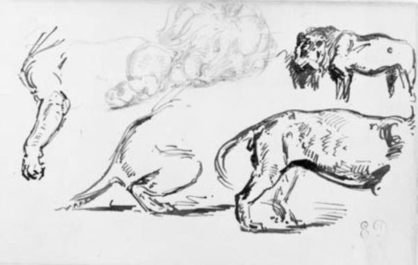 This is Edvard Munch's "Lion Lying Down," a drawing done with charcoal, or something similarly smudgy. You can tell he's working it, rubbing it in, really using the process to get at the form. I love the simplicity here, how Munch captures the essence of the lion with such immediacy. Look at the way he uses the side of the charcoal to create broad, shadowy areas, then switches to a sharp point for the details of the face. The texture is built up, layer upon layer, creating a sense of depth and volume. There's something so vulnerable about the way the lion is sprawled out, so different from the usual majestic depictions. It's like Munch is revealing a hidden side of this powerful creature. It reminds me a little of Delacroix’s animal studies, the way he used quick sketches to capture the vitality of his subjects. But Munch brings his signature angst to the piece, doesn't he? It's not just a lion; it's a lion burdened by the weight of existence.