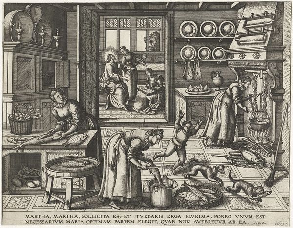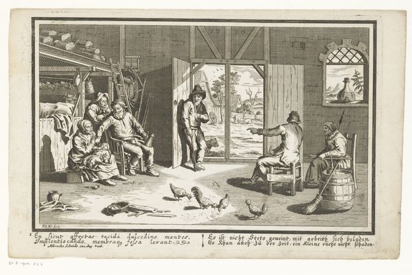 Curator: "Wie procedeert, heeft slapeloze nachten," or "He who litigates has sleepless nights," by Hendrick Goltzius, created in 1597. It's an engraving, and my first impression is that the linear precision is astonishing! How would you interpret the relationships between the figures and textual elements? Editor: I'm intrigued by how the composition is divided; the bedchamber seems to represent a state of anxiety, but I’m unsure about how to connect this to the women on the right, especially with one about to be whipped. What do you see in this piece? Curator: Notice how Goltzius orchestrates a dynamic interplay of lines, light, and shadow to underscore a conceptual narrative. We observe two contrasting realms—a dark chamber and a light hall—illustrating the dual consequences of conflict. Note the crispness of the figures' robes, and the tonal shifts which render a sense of depth and volume to this complex narrative. The text provides crucial context. Have you examined it closely? Editor: Yes, I did. It feels like it acts as captions providing explanation or clarification, especially when linked to particular people depicted, Anxiety whipping Sleeplessness! It provides clues about how to visually comprehend the complex relations being represented in the print. Curator: Precisely. By giving prominence to line and form over color, Goltzius reduces narrative elements into pure visual forms which allows us to see an emphasis upon symbolic actions within his tableau. We understand anxieties whipping someone due to lack of sleep. What stylistic choices did Goltzius implement in portraying abstract concepts as human figures within structured environments to comment on these sleepless anxieties. Editor: This piece is more intricate than I initially thought. Looking closely at these choices, I better grasp its artistry, especially regarding those carefully designed textures and textual inclusions within. Curator: I concur; recognizing his expert employment of both linearity alongside compositional choices highlights themes relating human anxieties connected conflict during life's tumultuous moments, resulting, potentially at least, upon one not resting peacefully at night because of the troubles associated fighting daily concerns or challenges