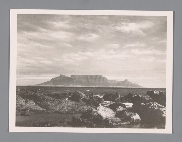 Editor: This photograph, “Gezicht op de Tafelberg en de Twaalf Apostelen in Kaapstad,” dating from around 1940-1960 by Blackshaw, captures such a sublime vista. The figure really brings out the scale of the mountain, making the scene feel both expansive and serene. What symbolic readings jump out at you? Curator: This image, with its lone figure gazing towards Table Mountain, immediately brings to mind the concept of the *wanderer* often seen in Romantic art, representing an individual contemplating the sublime power of nature. Notice the "Twelve Apostles," that majestic range; it acts as a constant, a visual metaphor perhaps for stability or endurance. Editor: So the landscape takes on a deeper meaning beyond just being a pretty picture? Curator: Absolutely. The mountain itself, with its flat top, feels like an altar. Think about what a table signifies: communion, sharing, knowledge. Blackshaw presents South Africa’s Table Mountain in such a way to create meaning and generate feelings tied to land and being. This figure seems to meditate before it, as though seeking wisdom or perhaps acknowledging something fundamental about the nature of existence. What does it bring to your mind? Editor: I can see what you mean, its stoic form reflecting back the man’s silent appreciation. It’s making me consider ideas around identity, like he's connecting with this place through the mountain. Curator: Exactly! Place and identity are so often intertwined in visual representation. This scene speaks not only to South Africa's physical beauty, but also to the complex relationship people have with it. Images serve as an affirmation and celebration of place, even in the midst of potential turmoil or reflection. Editor: I hadn’t considered that aspect, but looking closer now I realize it adds a really vital dimension to how the photographer depicts the mountain and man! Curator: Indeed! So the image’s immediate feeling is quite different when appreciating all the aspects you’ve introduced me to.