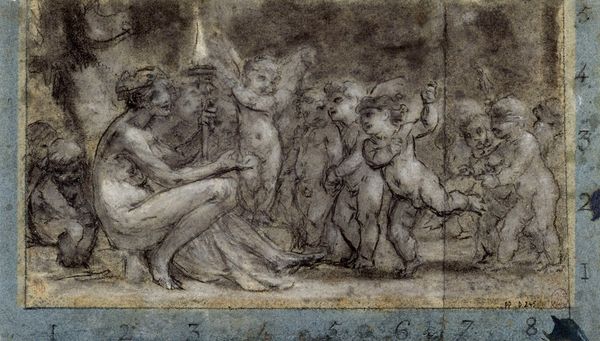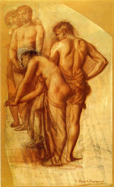 Editor: Here we have Andrea Mantegna’s “Three Deities,” created around 1500, in oil paint and drawing. It's held at the British Museum in London. The figures are striking, but they seem almost bleached of color, giving the whole scene a solemn air. How do you interpret this work? Curator: This piece speaks volumes about the Renaissance's engagement with classical mythology and its impact on gender and power dynamics. Looking at these figures, we aren’t just seeing depictions of deities, but also representations of societal ideals and power structures as conceived at the time. Editor: Power structures? Could you expand on that? Curator: Consider who these deities might be and how they are portrayed. Their nakedness, their poses… Are they empowering, vulnerable, or perhaps something more complex? This period often saw a tension between the celebration of the classical body and the imposition of contemporary social norms. It’s fascinating to think how Mantegna, in choosing these deities, also chose to highlight or perhaps even challenge prevailing gender roles of the time. Do you notice how each of them holds distinctive attributes or symbols of their identity? Editor: Now that you mention it, I see the one in the center appears more dominant, holding a spear. Curator: Precisely. How does that imagery resonate when considering questions of gender, authority, and even the legacies of colonialism so entangled within collections of the British Museum itself? Considering artworks as active participants in cultural discourse, instead of mere historical objects, gives us insight on the Renaissance’s legacy. Editor: It’s incredible how much these figures from so long ago still have to say about us today. Thanks for pointing that out, Curator! Curator: The Renaissance was a complex period. Examining how art reinforced or questioned the prevailing narratives remains crucial to understanding ourselves.