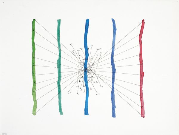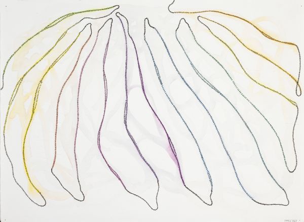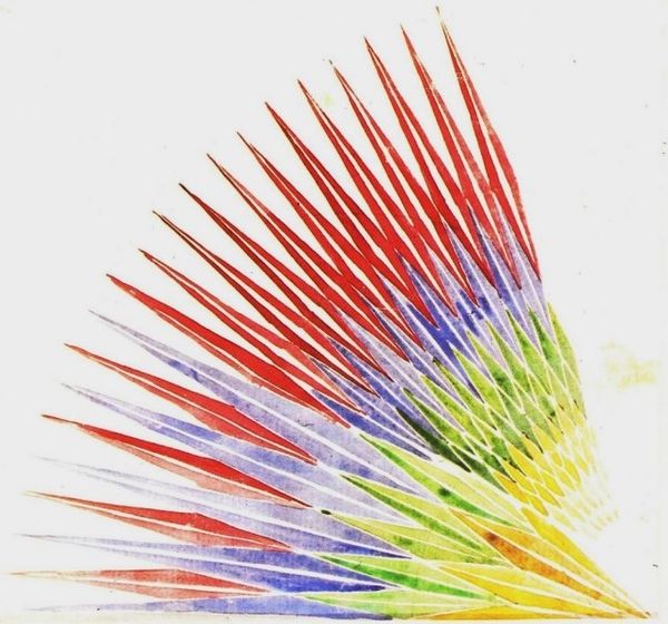 Pablo Rey made this artwork titled Estados complementarios #C0 19, and it's a fascinating dance of color and line. There's a sense of something very considered and handmade. The interplay of colors, like orange, purple, green, and blue feels like an exploration of how our eyes and minds make connections. The drawing has a wonderful clarity, and these crisp lines shoot outwards, creating a sort of structured yet chaotic optical effect. Take a look at how each form is a world of its own, with its own distinct texture and rhythm. The way Rey uses color to define these shapes is very particular, creating almost a code or language of feeling. It reminds me of Hilma af Klint's abstract symbolism, where forms and colors carry deep meaning, or perhaps even Sol LeWitt's geometric experiments, but with a more emotional and personal touch. It's all about the ongoing conversation between artists across time.
