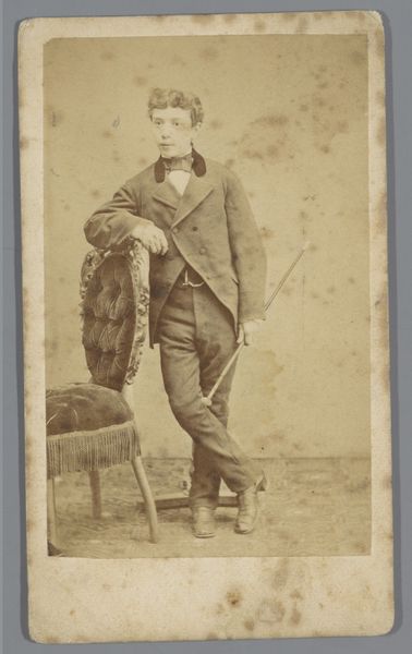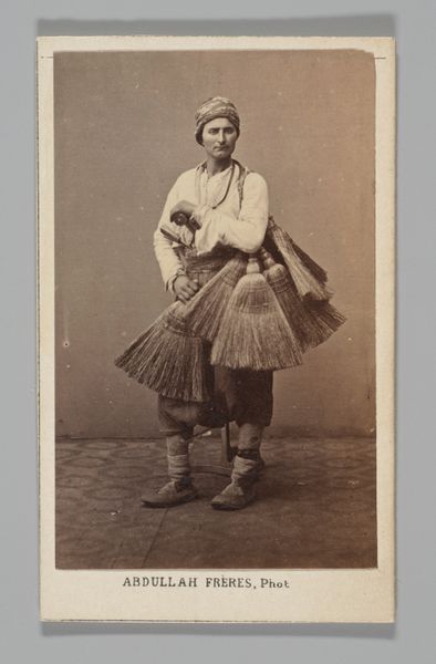 Curator: Here we have "Man met bepakte ezel, Italië", or "Man with Packed Donkey, Italy," a photograph created sometime between 1865 and 1888 by Giorgio Sommer. It’s an albumen print, currently residing here at the Rijksmuseum. What’s your immediate impression? Editor: It's… pastoral. In that melancholic, slightly romantic way. The soft sepia tones give it an otherworldly quality, like a memory fading at the edges. Curator: Indeed. The composition, however, strikes me first. Notice how the photographer uses the packed donkey as a central mass, a compositional anchor if you will, around which the narrative unfolds. The verticality of the man, juxtaposed with the burdened, almost drooping posture of the donkey, creates a visual tension, does it not? Editor: Absolutely. The weight on the donkey—literal and metaphorical—contrasted with the man’s somewhat passive stance... it feels…unequal. I imagine life back then involved some tediousness and hardship. The photo doesn't shy away from revealing those burdens. Curator: One could delve into semiotic readings of the burdens the donkey bears: what is its meaning? Are they merely goods for trade, or symbols of a more profound toil? It is, in some senses, a very careful construct playing upon genre painting. Editor: Could be both! To me, the rough textures of the baskets strapped onto the donkey make me imagine sun-baked earth and calloused hands. The dust clinging to their clothes. Curator: The very materiality of the albumen print enhances that. It’s no glossy contemporary image. Its fibers hold history. Editor: And even that small splash of light illuminating the man’s face! His face reads… wistful? The burdens of life have obviously marked him, but he stands tall with… resignation. Is there any sign of the rebellion against social class? Curator: I am always struck by how meticulously these early photographs were constructed, and with what intent. The photograph as artifice. Editor: Agreed. And maybe it's that tension between artifice and life that makes it so compelling, all these years later. To freeze such a candid picture—what a feat. Curator: Precisely, the interplay between these contrasts enriches this image far beyond what it shows on the surface. It’s a complex narrative wrapped within a seemingly simple snapshot. Editor: Absolutely. And even in its stillness, I hear the donkey’s hooves and the whisper of the wind across an Italian landscape. A moment captured, hinting at so much more.