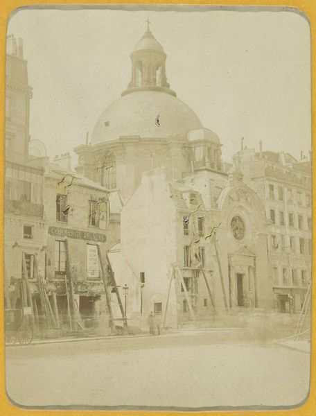 Curator: Immediately striking, isn’t it? A daguerreotype by Fritz Gratl titled, "Seilergasse met uitzicht op de stadstoren in Innsbruck, Oostenrijk," placing us somewhere between 1850 and 1920. The soft sepia tones lend it an aura of bygone eras. Editor: There's a stark contrast between the stillness of the architecture and what must have been the hustle and bustle of that street. It feels suspended in time, doesn’t it? Like a memory slowly fading. The tall city tower acts almost as a compositional lodestone. Curator: Indeed, the spire pierces through the image vertically, establishing both depth and a spiritual resonance, drawing your eye skyward despite the earthy activities at street level. In many ways, these early photographs created a shared visual record, helping shape perceptions of cities like Innsbruck as places of aspiration, and industry. Editor: I agree about its social implications. We must remember, though, the act of seeing has been fraught. These carefully composed streets hide as much as they reveal. For whom was this picturesque quality crafted and by whose labor? Are we truly seeing the day-to-day reality for most Innsbruck residents? Curator: Those are crucial considerations, it shows us more than the stones. Look at the hanging signage, the slight blurring around the figures. Each element operates like a cultural cipher, echoing commercial, even personal stories. Editor: I am always drawn to such historical records. What symbols might viewers in a century interpret here that we fail to notice? Or vice-versa; it serves as a sobering reminder that cultural memory is never complete or universally shared. Curator: Agreed. It's not just about what's present in the image, but about what's evoked and remembered. It reminds us to seek diverse perspectives when piecing together historical truths. Editor: Absolutely. Analyzing images like this allows us to deconstruct the past’s visual narratives. It becomes a tangible encounter with history that might change our shared view of it.