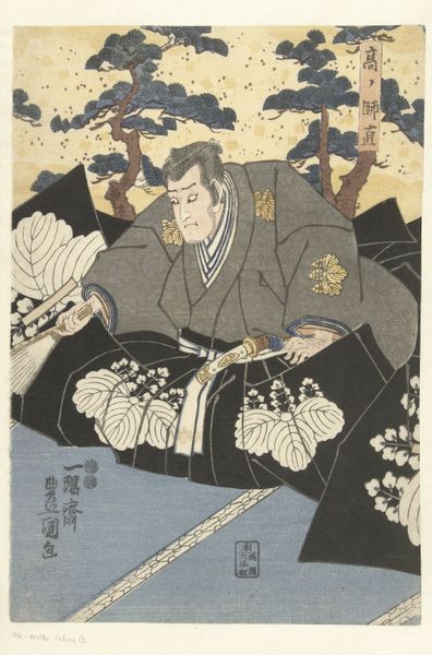 Editor: Here we have Katsukawa Shun'ei’s woodblock print from around 1793, "The Actor Sawamura Sojuro III in Ceremonial Attire." It strikes me as both powerful and…a bit satirical, actually. How do you interpret this work, given its cultural context? Curator: The figure of the actor, especially in Ukiyo-e prints, carries a great deal of weight. It's not just an image of a person; it’s a carefully constructed representation that reflects social hierarchies, expectations around performance, and gender. Note the ceremonial attire, designed to project authority. But also observe the actor's slight smirk, and Shun'ei's own *exaggerated* style that hints at caricature. Does that challenge traditional notions of power? Editor: Definitely! It feels like it's simultaneously celebrating and questioning this actor's status. It’s like, "Yes, you’re important, but don't take yourself too seriously." Is there a connection between Ukiyo-e and other forms of social critique at that time? Curator: Absolutely. Ukiyo-e prints, while often catering to popular tastes, also operated as a space where social commentary could be subtly embedded. They allowed for a democratization of art; disseminating imagery beyond elite circles. By depicting actors, courtesans, and everyday life, they challenged traditional artistic subjects and hierarchies. And Shun'ei himself seems to use this print to examine fame, performance, and perhaps even challenge the audience’s perception of reality versus representation. What do you make of the backgrounds use of symbolism in relation to the Kabuki performer’s status in society? Editor: I see what you mean. The background looks more abstract, which almost creates the feeling that the Actor exists separately, in his own little space in society. That certainly is thought-provoking and a completely new point of view for me! Curator: Indeed. Shun'ei offers us a potent blend of admiration and critical distance.