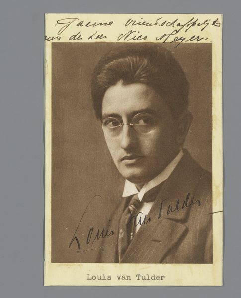 Curator: This gelatin-silver print, circa 1907, offers us a portrait of the composer Oscar Straus. Editor: It has a wistful, almost melancholic mood to it. The soft focus gives him an ethereal quality, wouldn’t you say? Like a fading memory. Curator: The Pictorialist style certainly leans into that. Photography at this time was trying to emulate painting, creating an impressionistic, almost dreamlike effect, softening realism with specific techniques. The blurred edges and subtle tonal gradations, were meant to express inner emotion through aesthetic means. Editor: Looking at his eyes, they're really pulling me in. The artist has cleverly used light and shadow to enhance their expressiveness. Curator: Yes, within the context of musical portraiture, the gaze becomes paramount. Composers were seen as conduits, divinely inspired. Their portraits had to convey depth of feeling, tapping into the cultural perception of genius, suffering, and artistic temperament, ideas we have even now! Editor: The slightly asymmetrical composition draws the eye. The light catching his brow also leads the viewer to the signature written onto the piece itself, bringing more immediacy to the portrait. It’s as though Straus is right here with us. Curator: This aligns with photographic realism attempting to humanize public figures, allowing viewers an 'intimate' moment. Although highly constructed, the photographic process was meant to create an approachable depiction of Straus’ identity for wider audiences. Editor: Considering this photograph was made during a period when modernism was emerging, do you see a shift away from older aesthetic values embedded within the image? Curator: Well, despite leaning towards more painterly aesthetics, there’s still this stark presentation of the sitter. I wouldn’t go as far to say that the image rejects any values completely, but more that this approach softens the edge into the direction it intends to travel. Editor: The soft focus truly captures something fleeting. Curator: An iconic era rendered intimately and symbolically.