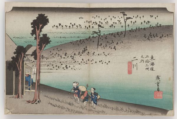 Editor: This is Utagawa Hiroshige's "Chiryū--Summer Horse Fair," a color woodblock print from around 1832-1833. I’m immediately drawn to the texture and the subdued colors. What’s your interpretation? Curator: It’s a fantastic example of Ukiyo-e prints and their mass production for popular consumption. I’m thinking about the labor involved in creating each individual impression, from carving the woodblocks to mixing the inks from organic and inorganic materials. Do you see how the composition reflects this industrialization, how it simplifies the landscape? Editor: Yes, there's a sort of grid created by the posts and lines of horses that leads the eye back. Is it commenting on something specific, beyond just depicting the fair? Curator: Consider the cultural context. This fair wasn’t just about buying and selling animals, but a hub of economic activity. The materiality speaks to how resources—wood, pigments—are transformed into objects of both utility and aesthetic pleasure. How does the act of reproducing images on paper itself become a commodity within a larger system of consumption? Editor: I see. So, the choice of medium, a print, inherently connects the artwork to the systems of labor and economy present in the scene it depicts. Is that correct? Curator: Exactly. The layering of blocks, each adding color, points towards the division of labor and the standardized process of manufacturing within the printmaking workshops. This seemingly idyllic scene, therefore, unveils a complex interplay of aesthetics, production, and consumption. Editor: That's given me a new appreciation for the technical process behind these prints, and their link to commerce. I hadn't considered that so directly before. Curator: It’s all about seeing how materials and the means of their manipulation reflect larger social forces.
