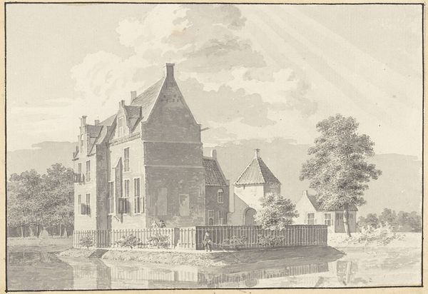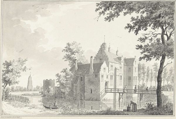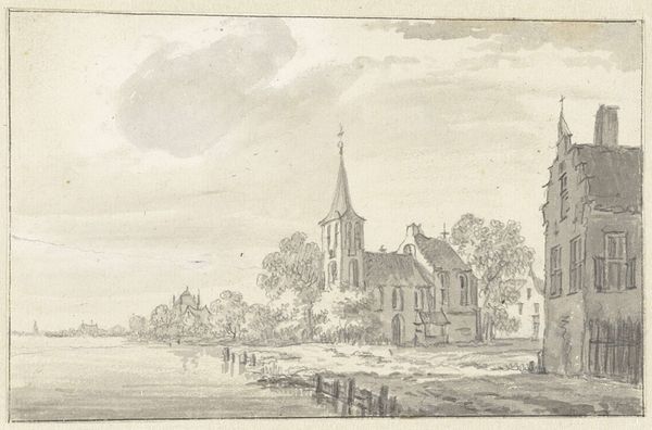 Curator: Look at this subtly detailed cityscape; "Gezicht te Utrecht met de St. Nicolaaskerk" by Jan de Beijer, made sometime between 1713 and 1780, created with ink on paper. Editor: It’s tranquil, almost dreamlike. The muted tones give it an ethereal quality. I feel a certain stillness emanating from it. Curator: Notice how de Beijer has carefully rendered the architecture, particularly the Saint Nicholas Church itself. He's capturing not only a building, but also an economic and social structure, because resources had to be obtained to realize this. Consider, too, that he did this with ink, which wasn't a common art material for other purposes. Editor: Churches are interesting sites of image appropriation, certainly. Its tower dominates the skyline, doesn’t it? A symbol of faith, order, but perhaps even power, during this time in Utrecht's history. That waterway and the drawbridge add such charming features too, like gates of passage for life itself. The small boat looks heavy. Curator: And that brings a different sort of labor, as boats and bridges facilitate commerce, connecting different classes. It’s also interesting to see a moment in time captured, of those working versus who can watch those working from the windows. The level of detail makes it probable he went outside to draw, making that craft's quality especially labor-intensive. Editor: Do you think he made any edits from the first version? Given his expertise with symbology and allegory, the symmetry must also suggest some of his spiritual outlooks as well. Curator: I wouldn’t be surprised! Artists, or any worker, change materials as they understand new elements or opportunities to further their own ideas or vision. Editor: It’s been interesting considering not just what the drawing represents but the implied value of the cultural objects shown and those not included. Curator: I agree; focusing on the labor and material really shifts our perspective from an appreciation of form, to appreciation for production, showing a society in progress.