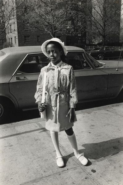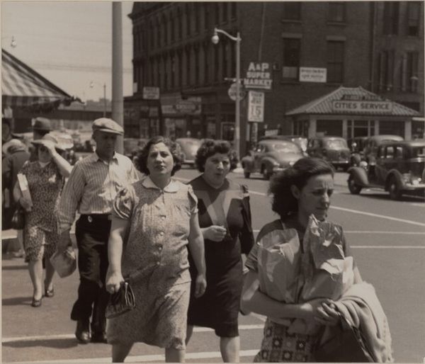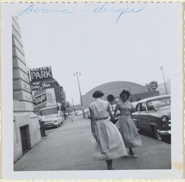 Curator: Gordon Parks' photograph, "Department Store, Mobile, Alabama," taken after 1956, captures a striking tableau of segregation. The work utilizes color film. Editor: My immediate impression is of quiet defiance. The palette feels deliberately muted, almost as if trying not to disturb the ugliness on display. The subjects are rendered with what almost seems like poised dignity amidst this rather bleak environment. Curator: The composition is quite telling. Parks uses the architectural lines of the storefront to emphasize separation. Note how the neon sign proclaiming "Colored Entrance" visually dominates the scene, dividing the space and dictating access. The diagonal created adds a subtle unease, complicating the presumed straightforwardness of the shot. Editor: I'm drawn to the materiality here as well. The clothing, those lacy fabrics, the carefully chosen shoes—they speak of aspiration and a desire to participate in consumer culture from which they are actively barred. These materials contrast sharply with the blatant segregation displayed by the crude sign overhead. Think about the physical labor it takes to keep things bright. Curator: Precisely. The formal arrangement subtly mirrors the social divisions of the time. Look at the tonal contrast: The women's light-colored dresses against the shadowed storefront, it reads as both hope and a marker of difference. There is so much semiotic information within Parks' composition. Editor: And consider the manufacturing and consumption inherent in a department store, places where materials meet desire and identity. This access is not the same for the women, so what labor happens here behind the scenes? The photograph becomes an object itself of material critique—documenting these imbalances. It's no simple snapshot; it's carefully considered documentary work. Curator: It is the genius of Parks that he captures a historical moment while simultaneously creating an artwork of immense structural and aesthetic power. Editor: Parks really uses film as a potent artifact to uncover what these circumstances demanded of human beings. A crucial moment captured.