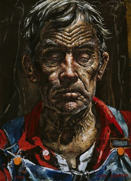 Chronis Botsoglou painted this portrait of a Fisherman at Mytilini using traditional oil paint on canvas. The material itself is relatively straightforward, but the way Botsoglou applies it tells us a lot. Look closely, and you'll notice the rough texture he's created. The brushstrokes are visible, almost like the furrows on the fisherman's face itself. These marks emphasize the physical presence of the paint, its inherent qualities of texture and form. It is a stark contrast to the smooth, idealized portraits you might see of the wealthy. The processes involved in the painting – the mixing of pigments, the layering of paint, the careful observation of the subject – all contribute to the artwork's social significance. Botsoglou engages with a long tradition of portraiture but shifts the focus to the working class, highlighting the labor and lived experience etched into the fisherman's face. Ultimately, Botsoglou reminds us that even the simplest materials, when handled with skill and intention, can convey complex ideas about labor, class, and the human condition.